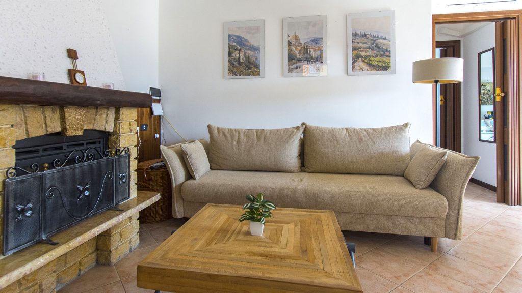 W przestronnym salonie z kuchnią znajduje się wygodna, rozkładana sofa, duży telewizor z płaskim ekranem oraz kominek. W części kuchennej wyposażonej we wszystkie niezbędne sprzęty (zmywarka, piekarnik, mikrofalówka, zmywarka, lodówka w zabudowie) dla gości przygotowano miejsce do wspólnego spożywania posiłków z dużym, drewnianym stołem. W dużej sypialni znalazło się miejsce na podwójne łóżko kontynentalne, pojedyncze łóżko kontynentalne i szafę do przechowywania. Łazienka z oknem, kabiną prysznicową i pralką.